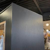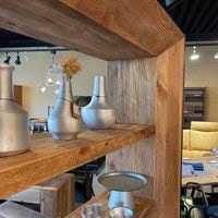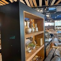 まるで巨大な額縁のようなオープンシェルフ主にパイン古材を使用し大変趣ある質感とデザインです。周囲をぐるりと囲むブラックの天然木のフレームが印象をクールにモダンなシェルフに仕上げています。円錐形の大きな脚も◎